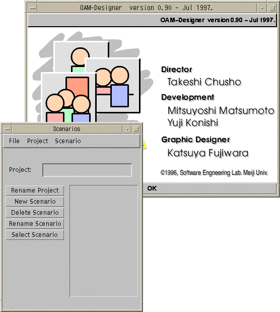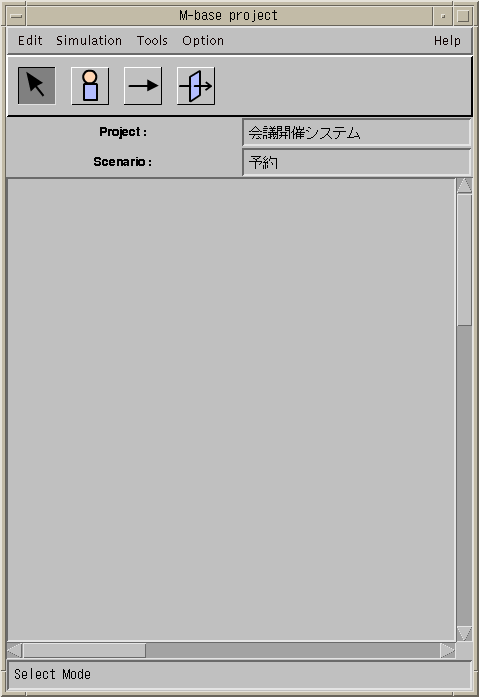 図4.2の画面で,対象システムの名前, 機能(シナリオ)の登録等を設定することが出来る. 機能の登録は, ``New Scenario''ボタンをクリックし, 機能名を入力することにより行なえる. ここでとりあげた会議開催システムでは,会議の予約,キャンセル, 予約状況の参照を設定した.