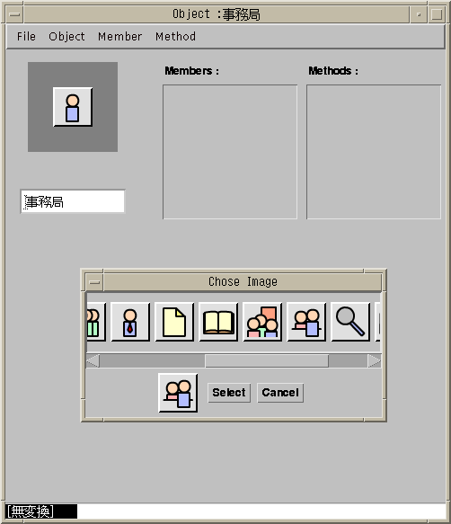 ``選択''モードを選択して,オブジェクトのアイコンをダブルクリックすると, オブジェクトの詳細設定画面が開く. 図4.5は事務局オブジェクトのアイコンを変更しているところである.