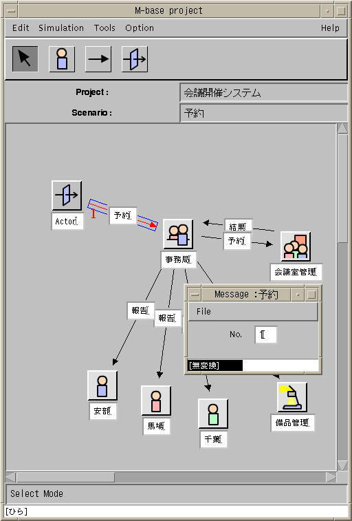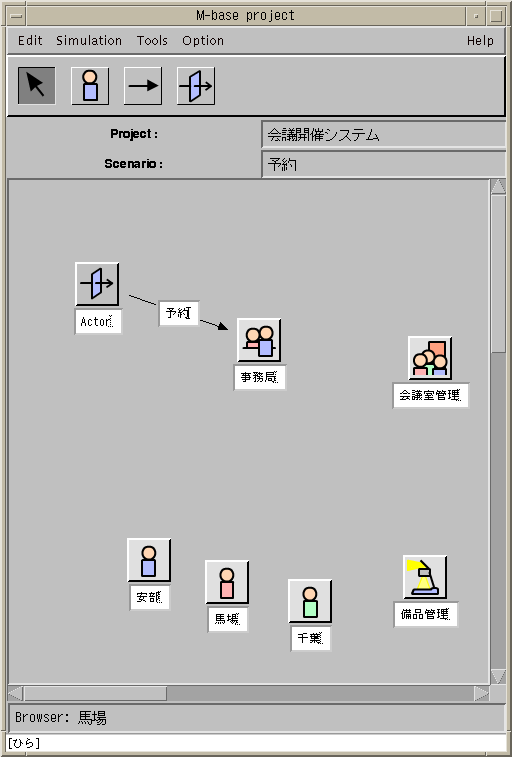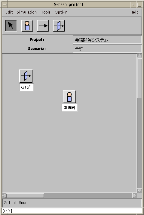 まず,アクタとオブジェクトの配置を行なう. それぞれ,上記のアクタ,あるいはオブジェクトのモードを選択して キャンバス上の適当な位置でクリックすることによりその位置に 各々のアイコンが表示される. オブジェクト名は,アイコンの下の入力部で設定できる. 図4.4は,アクタと事務局オブジェクトを配置しているところである.